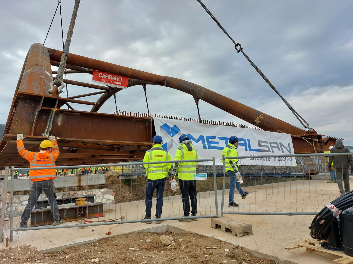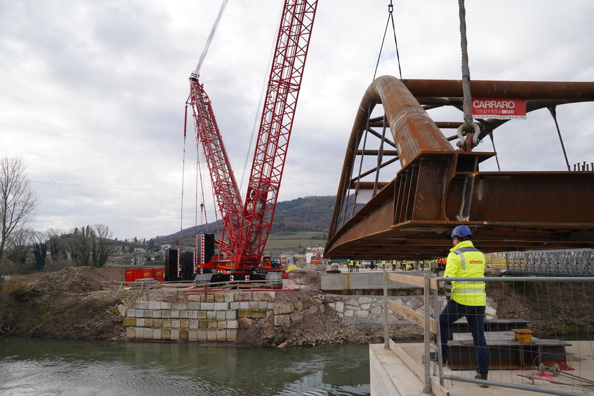 Un’operazione complessa quanto scenografica, durata un’intera mattinata, gestita dalla ditta Metalsan srl, che in RTI con Costruzioni Carraro geom. Adriano & C. S.N.C. si è aggiudicata l’appalto di costruzione del ponte, sotto la supervisione di Vi.Abilità.